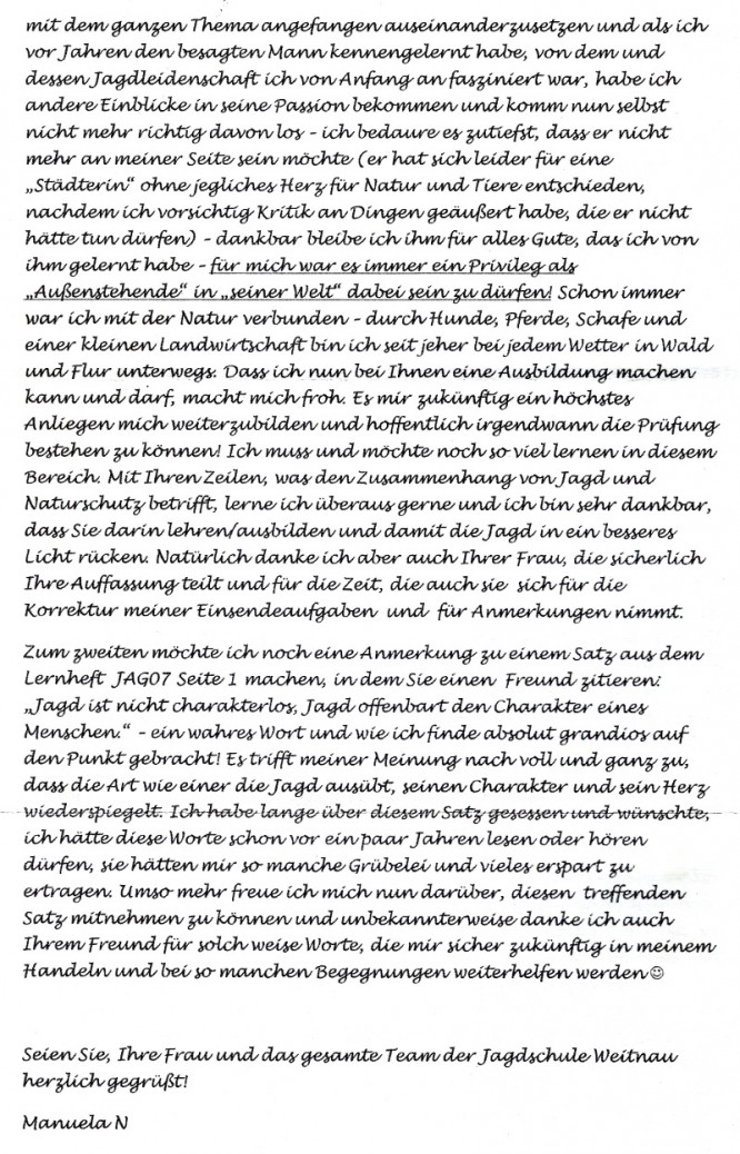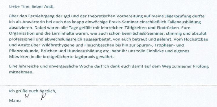 Eure Anstrengungen haben aus mir einen begeisterten Jungjäger gemacht. Dafür danke ich Euch. Ich wünsche Euch viel Erfolg bei Euren weiteren Unternehmungen der Jagdschule, macht weiter so.
