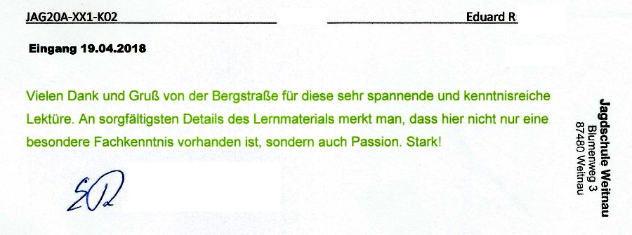 Bemerkung: Tine und Andi sind immer mit Herzblut dabei, Jagdanwärtern die notwendigen Dinge und jagdlichen Grundlagen beizubringen, um die Jagdprüfung in Bayern erfolgreich zu bestehen. Mir hat wie so vielen meiner Jagdkameraden insbesondere die Zeit gefehlt, sich zu festen Zeiten zu Vorlesungen oder Frontalunterricht einzufinden. Dank der Kooperation der Jagdschule mit der SGD Darmstadt (Fernschule) konnte ich die jeweiligen Kurse dann bearbeiten, wenn ich die Zeit dazu hatte (was meist nur in den Abendstunden wegen meiner Selbstständigkeit möglich war). Rückfragen wurden prompt und kompetent innerhalb kurzer Zeit beantwortet. Die Seminare (Schiessseminar sowie Praxisseminar) waren hervorragend. Ich kann die Jagdschule jedem jagdlich Interessiertem nur wärmstens empfehlen. Hier wird noch richtig ausgebildet und das mit der notwendigen Intensität und bestem Fachwissen. Die Betreuung in der Prüfungsphase, die auch aufgrund der Corona-Situation per Online-Teaching durchgeführt wurde, war hervorragend. Zuletzt schloss das Praxis-Handhabungsseminar die Prüfungsvorbereitung ab. So war es möglich, mir den Jagdschein erfolgreich zu Weihnachten selbst zu schenken. Deshalb gebührt der Jagdschule Weitnau mein ganzer Dank! Viel Erfolg weiterhin und jederzeit Waidmannsheil!