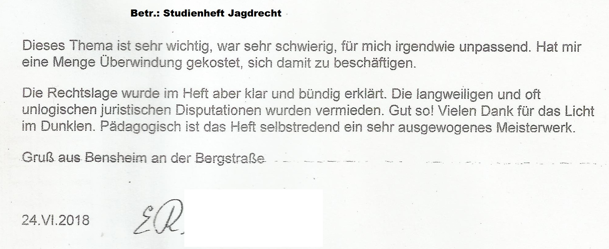 Für meine Ausbildung im Rahmen des SGD Fernstudiums bildeten Eure sehr guten Lernunterlagen eine hervorragende Grundlage. Besonders haben mir Eure jagdpraktischen Erfahrungen gefallen, mit denen Ihr die Fachthemen ergänzt habt. Die regelmäßigen Zwischenprüfungen (Einsendearbeiten) waren eine gezielte Vorbereitung auf die Jägerprüfung.