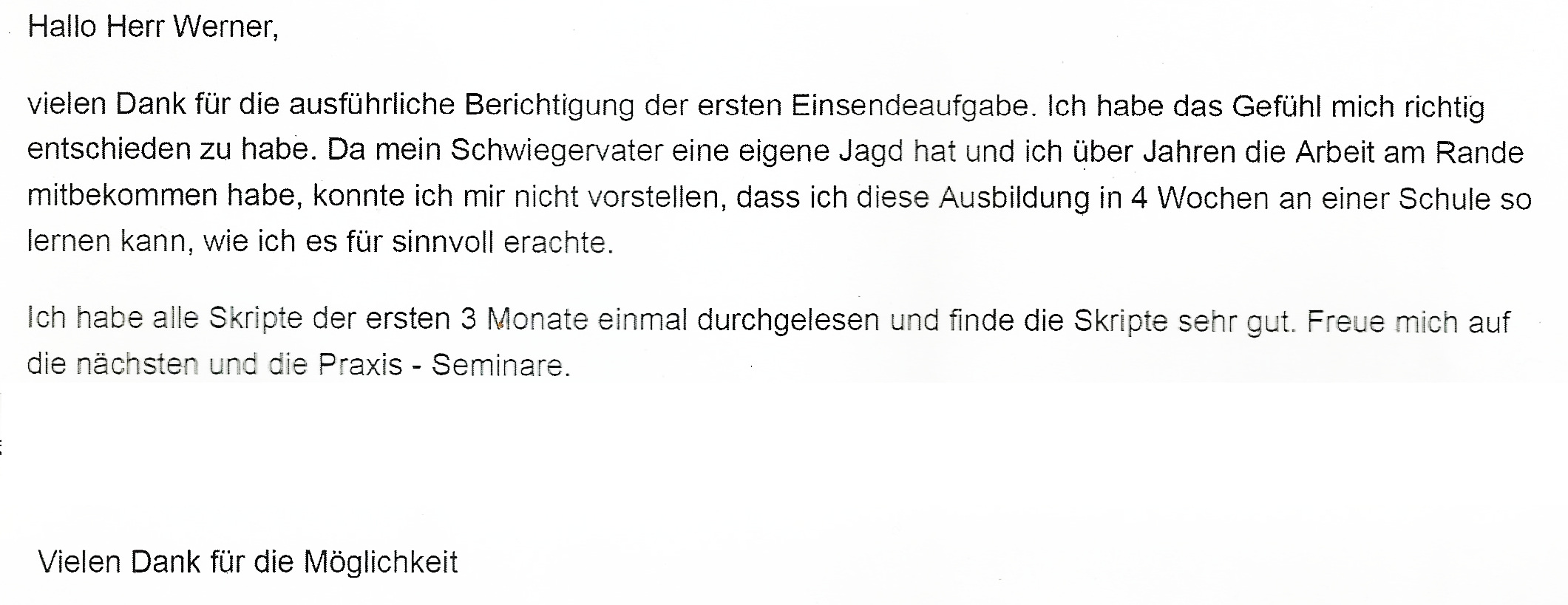 Eure Anstrengungen haben aus mir einen begeisterten Jungjäger gemacht. Dafür danke ich Euch. Ich wünsche Euch viel Erfolg bei Euren weiteren Unternehmungen der Jagdschule, macht weiter so.